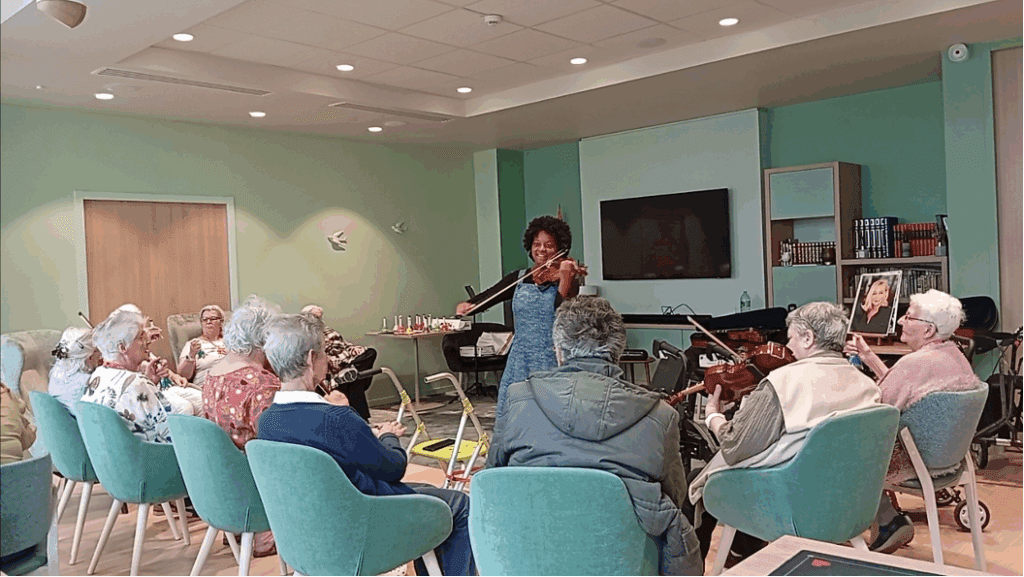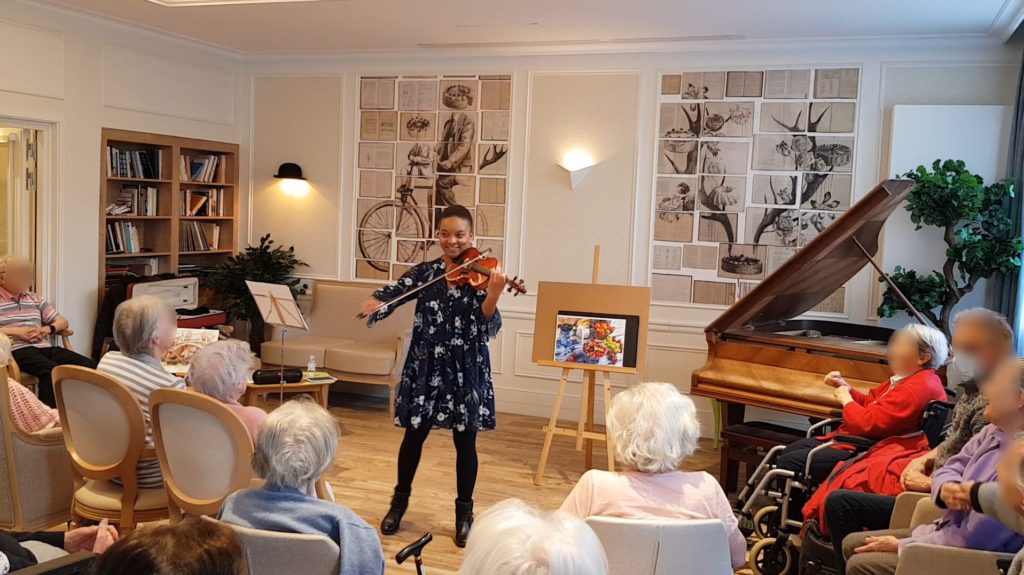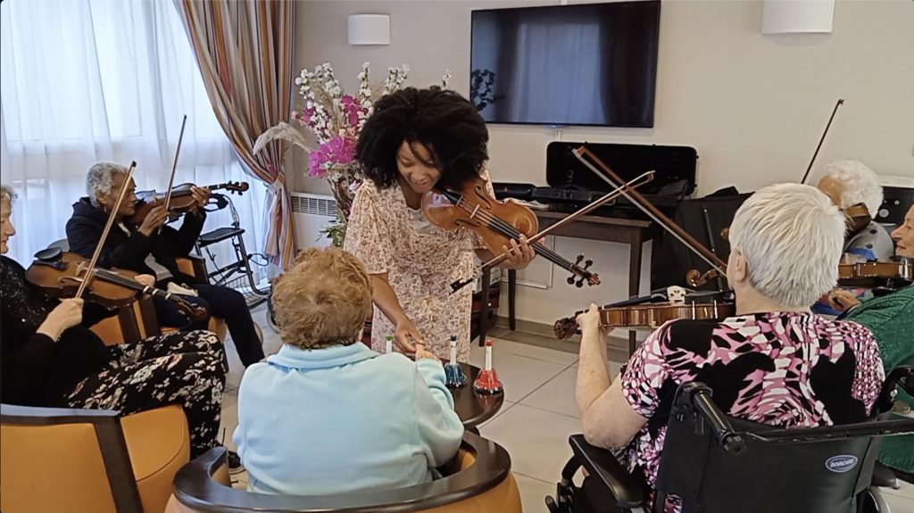 «L’intervention de Lydie, musicothérapeute, au sein de notre EHPAD a été particulièrement bénéfique pour nos résidents âgés. Grâce à son approche innovante utilisant le violon et une ouverture musicale variée, elle a su créer un espace d’expression et de connexion émotionnelle. Elle a également fait preuve d’une bienveillance exceptionnelle. Sa capacité à écouter et à comprendre les émotions des résidents crée un environnement sécurisant où chacun se sent valorisé et respecté. » EHPAD Le Clos des peupliers à Bobigny